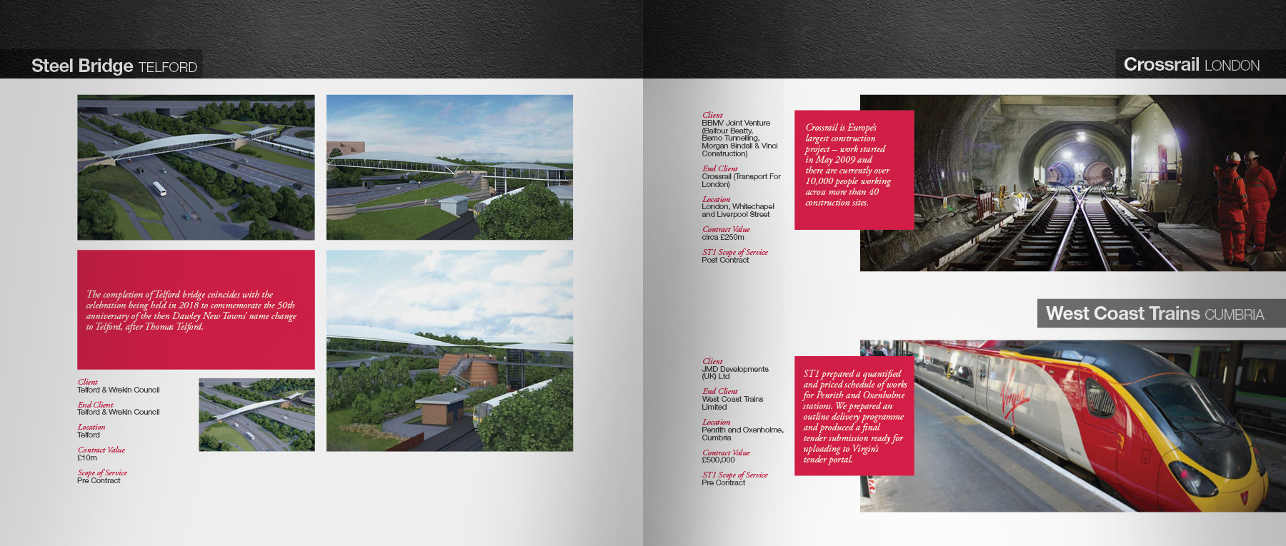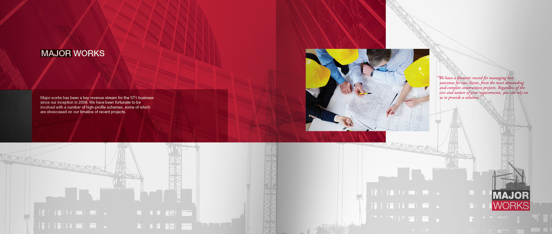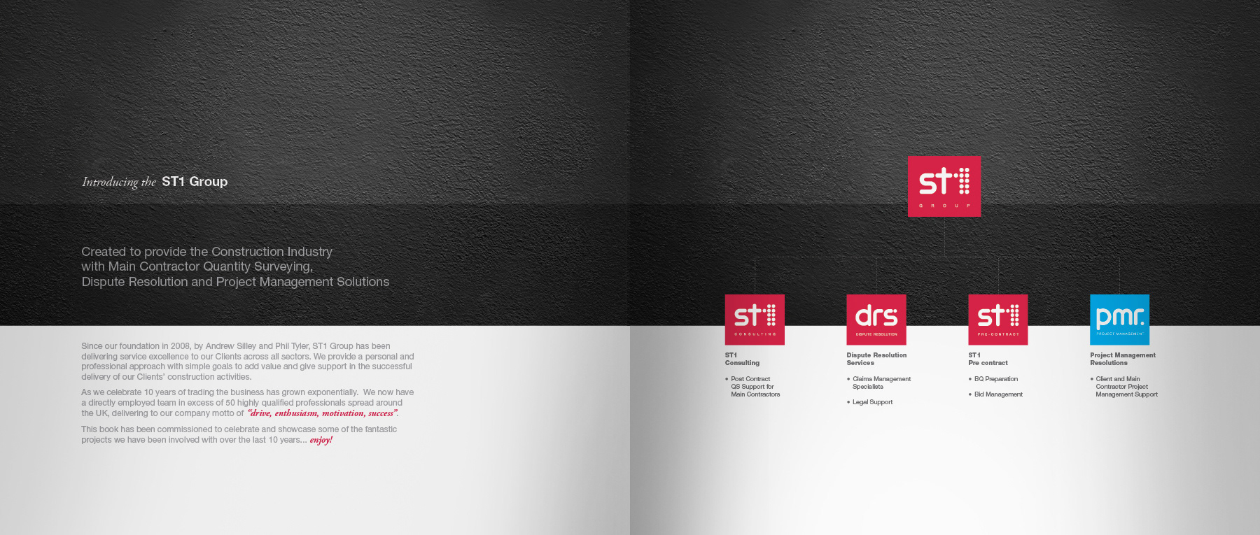 40 page corporate hardback book to celebrate 10 years of business, raise company profile and showcase major construction projects to potential new customers.